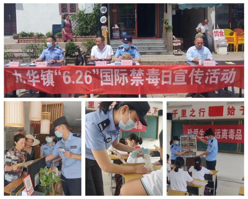 九华山风景区公安局联合相关部门进学校、进广场、进商铺,通过上禁毒课、设立宣传台、发放宣传手册、书签、悬挂横幅等,讲解了毒品危害,将禁毒知识带到群众身边,引导广大群众珍爱生命、远离毒品。