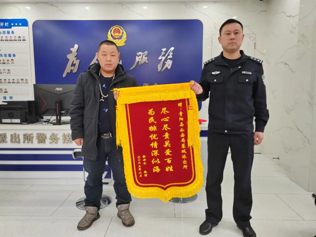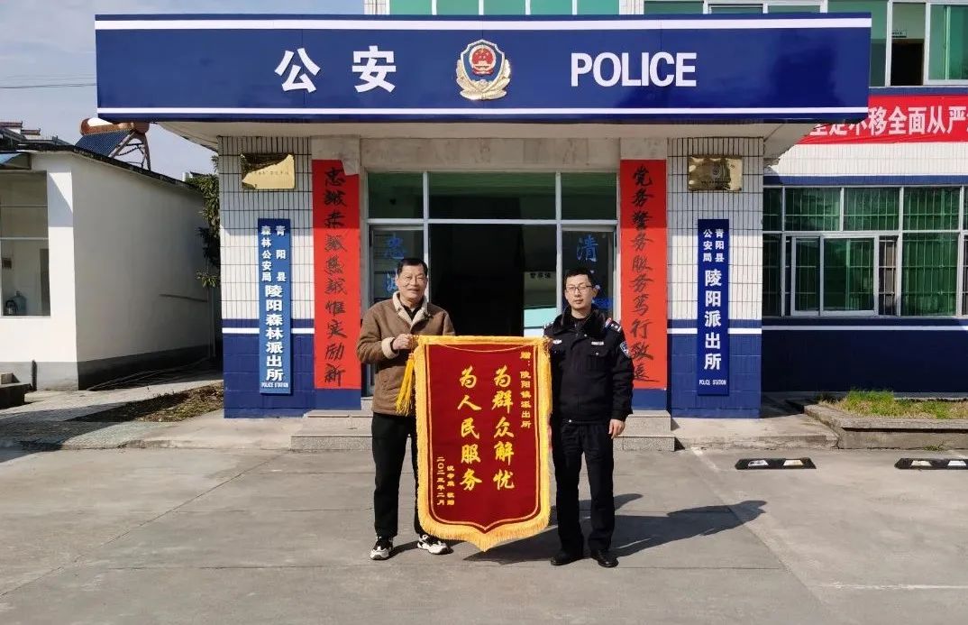 2月21日中午,汪先生特地定制一面印有“为群众解忧 为人民服务”的锦旗送到陵阳派出所,握着民警的手再次表示感谢。