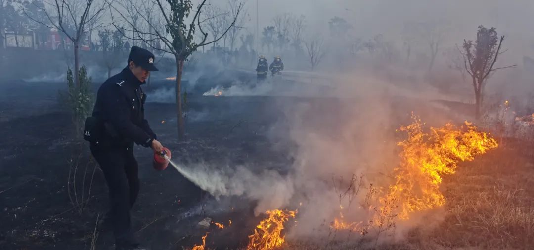 草坪,现场浓烟滚滚,燃烧面积较广,眼看火势即将蔓延至住宅区,民警立刻取出车载灭火器配合消防队员合力将火势扑灭。所幸控制及