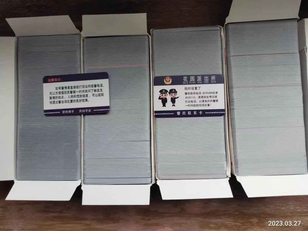 “您好,这是我们派出所的‘警民联系卡’请收好!遇见电信诈骗或者您有困难可直接联系民警。”3月28日,花园派出所民警、辅警深入辖区,面向群众发放“警民联系卡”,面对面告知群众遇到各类困难可随时拨打“警民联系卡”上的电话进行咨询,民警将第一时间提供帮助。同时还可方便群众咨询户籍业务,向民警反映情况、提供线索,让民警及时掌握社情民意,为群众排忧解难。从小事做起,从点滴抓起,通过“警民联系卡”连起警民的心,使民警与群众“零距离”交流,打通了警民联系“最后一公里”,进一步提升了人民群众的安全感和满意度。