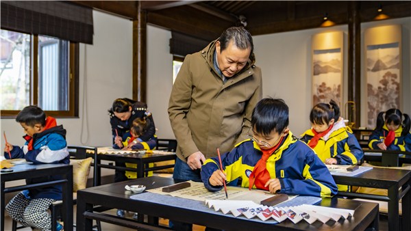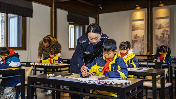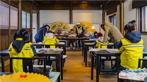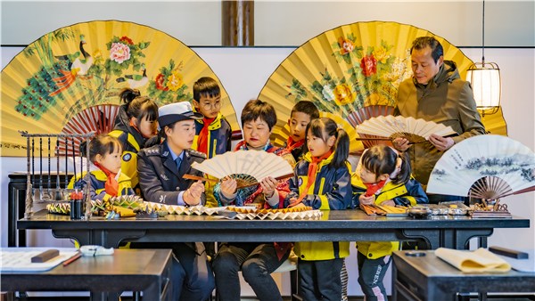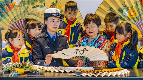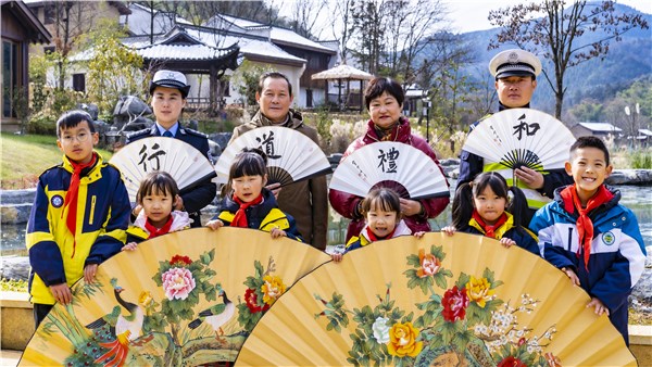 12月23日,安徽省青阳县公安局交警大队民警与安徽省非物质文化遗产九华玉骨扇传承人江太平、高萍夫妇,走进青阳县蓉城镇五溪新区文宗古村,开展以“行、道、礼、和”为主题的交通安全宣传活动,借“非遗”文化,向孩子们传递文明交通理念。图为活动现场。陈光学 摄