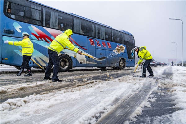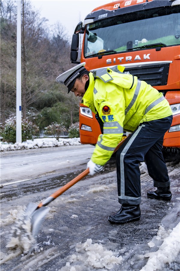 2月24日早晨,受降雪影响,318国道安徽省池州市青阳县境内清泉岭路段车辆通行受阻。青阳县公安局交警大队启动应急预案,全员出警,采取撒盐融冰、铲冰除雪、推车排险、指挥疏导、交通管制等措施,确保道路安全畅通。 图为民警清除道路积雪。 图片均为陈光学摄(影像中国)
