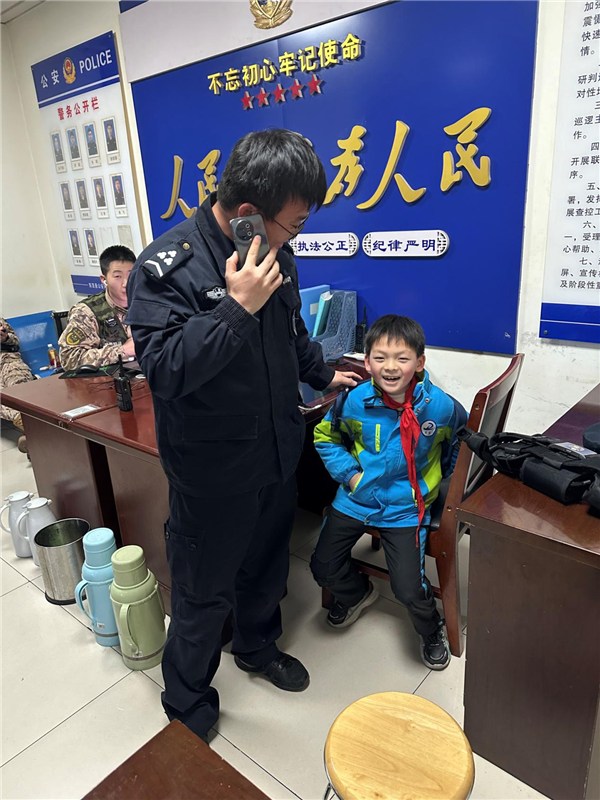 3月6日21时20分,一名八、九岁的男童蹦跶着跑进东至县公安局新天地警务工作站,上前拉着特警队员的手,称要给自己报个警。执勤特警队员立即仔细询问相关情况,得知小男孩是至德小学三年级学生,晚上辅导班结束后没有看到来接自己的家长,在附近找了一圈也没有找到家长身影,想着老师说过“有困难就求助警察叔叔”,便来到警务站。