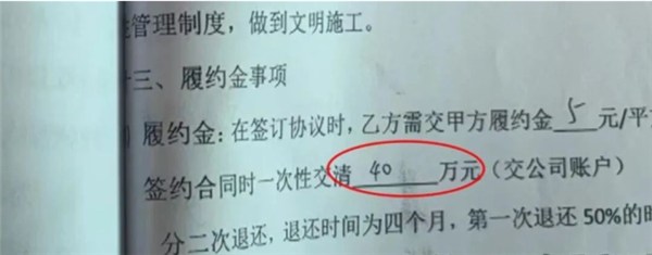 东至县公安局经侦大队民警方鑫说,“诸某某还以自己名下公司的名义,和被害人刘林发签订了一个劳务联营合同,同时在合同上约定,签订合同之后要交40万的履约金。他将40万分两次打给了犯罪嫌疑人诸某某所控制的永康时庆建筑劳务有限公司的名下。”