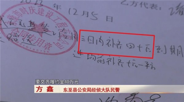东至县公安局经侦大队民警方鑫介绍,东至县胜利镇某公司对外分包项目,犯罪嫌疑人诸某某在2023年12月5号,和该公司签订了一个劳务分包合同,双方约定三天内,也就是12月8号之前,要交齐履约金40万元。但是到了12月8号,诸某某仍然没有交齐这40万,所以双方合同就终止了。