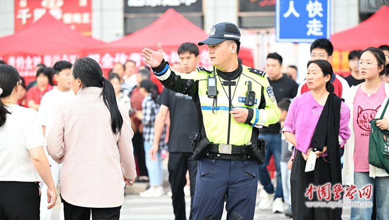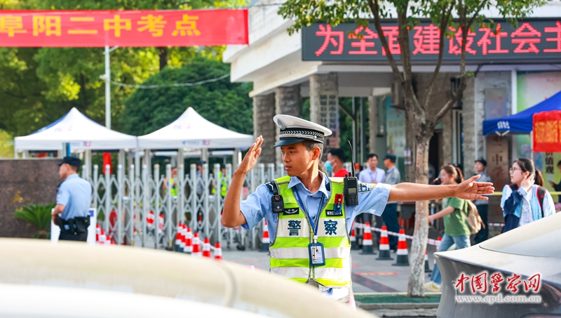 太和县公安局开启全警护航高考模式,全程护航保安全、全心服务为考生。图为民警在太和一中考场维持秩序。(王叠旭)