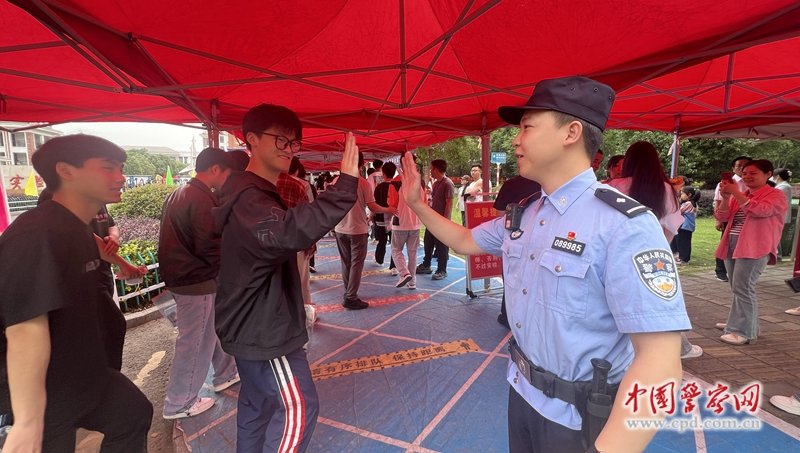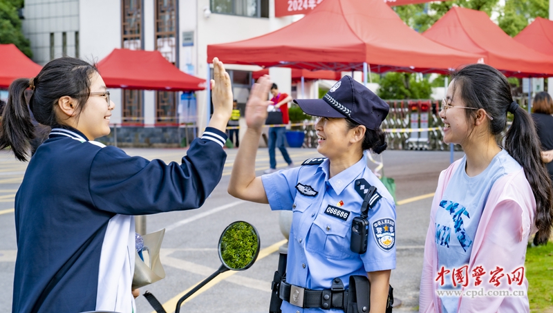 高考首日,进考场前,六安市公安局叶集分局民警与考生击掌,为考生助力加油!(刘大鹏)