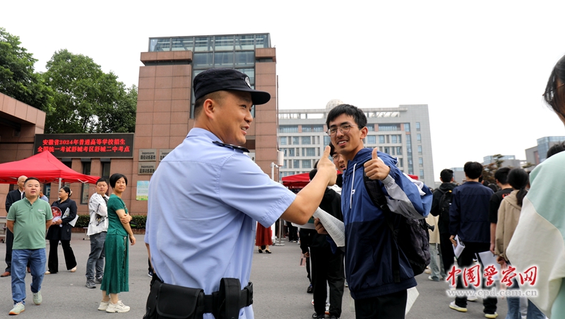 舒城县公安局经济技术开发区派出所及时组织警力维护考生进考场秩序,民警为考生加油,考生为辛苦执勤的民警点赞。 (王可海)