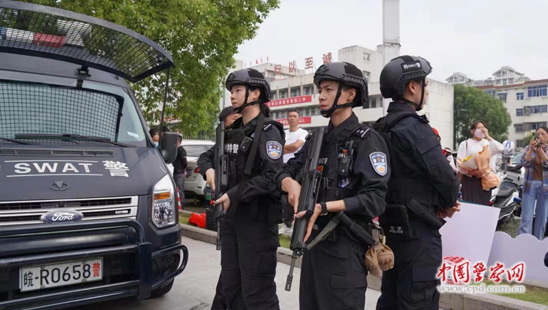 黄山市公安局黄山分局在区委、区政府及市公安局安排部署下,严密部署,出动警力,为高考考生营造平和、安宁、有序的考试氛围,全力以赴做好安保工作。(陈寅强)