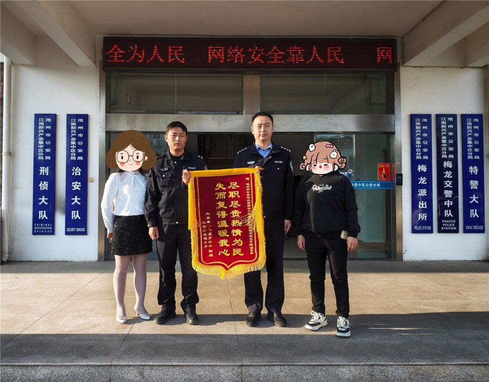 10月23日,罗女士将一面印有“尽职尽责热情为民 失而复得温暖我心”的锦旗,送到池州市公安局江南新兴产业集中区分局梅龙派出所,紧紧握住民警、辅警的手再三致谢,这温暖的一幕,源于一场跨越两个月的追款行动。
