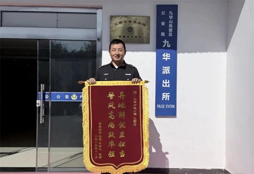 近日,游客张先生报警称,其在景区游玩时不慎将随身携带的背包遗失,内有重要证件,请求警方帮助。接警后,九华山风景区公安局九华派出所民警立即开展工作,最终在景区大巴车上找回张先生丢失的背包。事后,张先生特意寄来一面印有“异地解忧显担当 警风高尚效率强 ”的锦旗表示感谢。