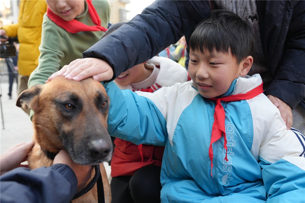在安全区域内,同学们在训导员的指引下,与警犬展开亲密互动。大家认真聆听关于警犬品种、生活习性及执勤工作的介绍,现场洋溢着欢快的氛围。