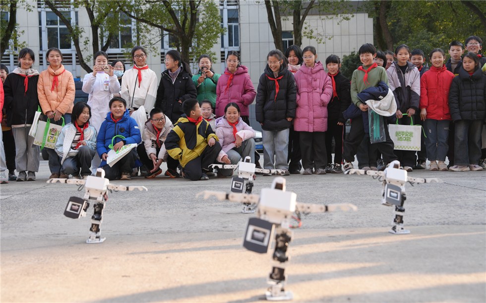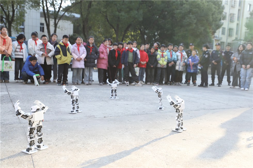 科技馆工作人员带着同学们近距离观看机器狗与机器人的酷炫表演,充满科技感的互动体验让大家沉浸其中、兴奋不已。