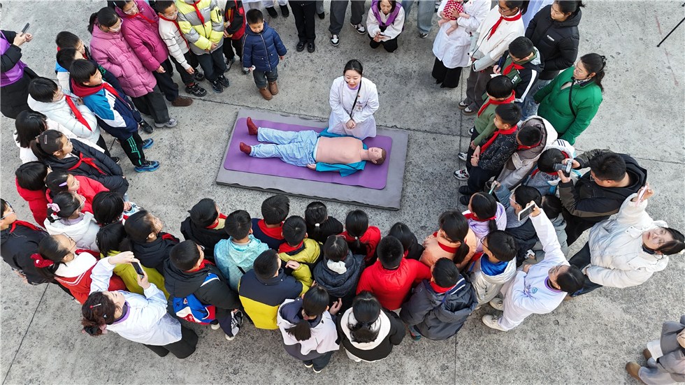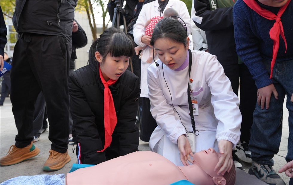 互动体验区氛围热烈融洽,安全知识科普润物无声。活动特邀专业医师现场开展急救知识科普,通过模拟演练,向同学们系统讲解并演示海姆立克急救法与心肺复苏的操作流程,切实提升同学们的应急自救能力。