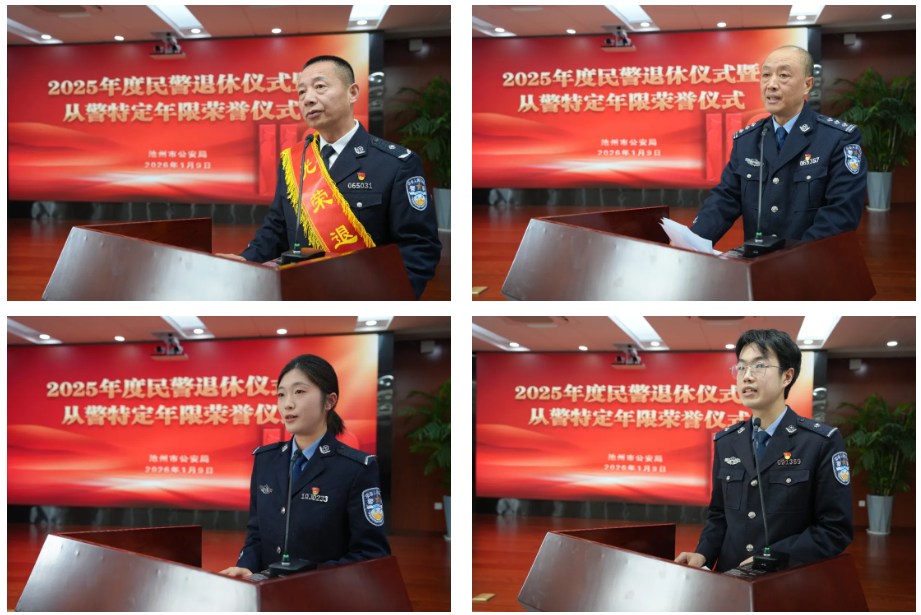 漫漫从警路,代代有传承。退休民警代表、从警特定年限民警代表、新警代表先后发言。退休老同志深情回望从警生涯,表达对组织培养、领导关怀、同事帮助的衷心感谢和对公安工作的热爱不舍。从警特定年限民警代表表示要继承和发扬老同志们的优良传统,不断带领和激励年轻同志务实拼搏,坚决履行好党和人民赋予的光荣使命职责。新警代表以铿锵有力的发言,表达了对公安事业的向往、对前辈楷模的敬仰,以及立志接过接力棒、续写新篇章的坚定决心。