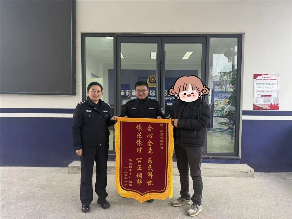 近日,青阳县公安局庙前派出所收到辖区自来水厂送来一面印有“全心全意 为民解忧 依法依理 公正调解”的锦旗。
