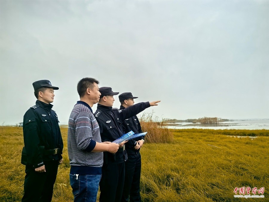 2025年10月26日,安徽省东至县公安局张溪派出所民警辅警在湿地巡查。乔燕 摄