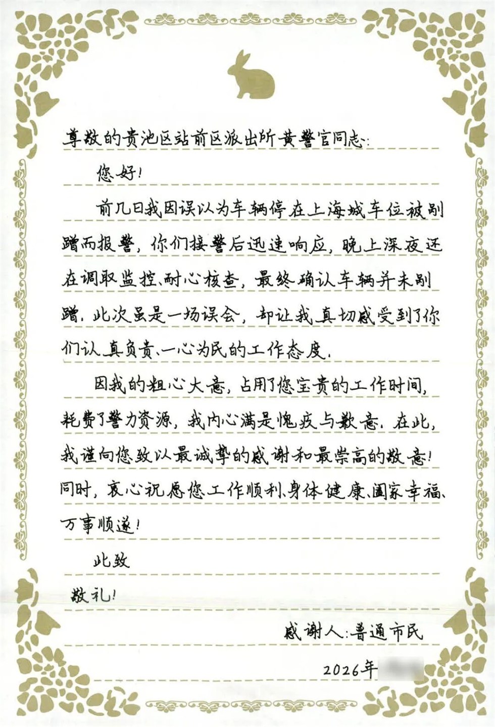 一封市民手写的感谢信