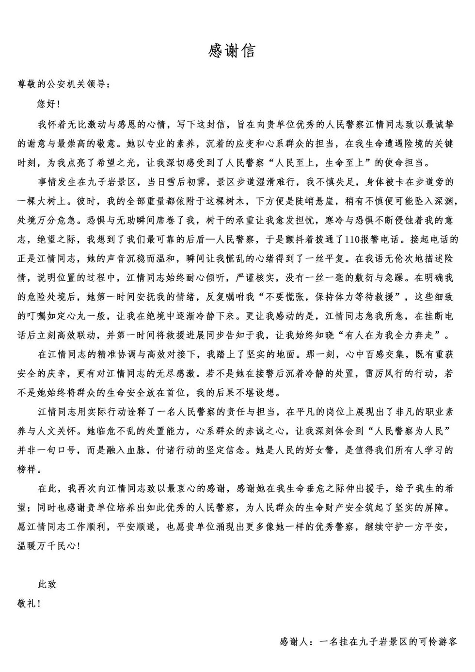 游客特意写下感谢信