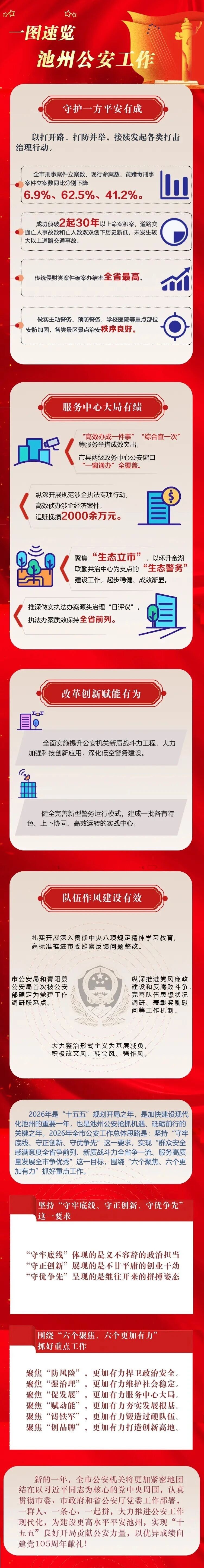 会议要求,2026年是“十五五”规划开局之年,也是池州公安抢抓机遇、砥砺前行的关键之年。全市公安机关要更好统筹发展和安全,以政治建设为统领,坚持“守牢底线、守正创新、守优争先”,完善公安机关职能体系,提升公安机关新质战斗力,推进高效能治理,深化法治公安建设,锻造公安铁军,大力推进公安工作现代化,为建设更高水平平安池州、实现“十五五”良好开局贡献公安力量。