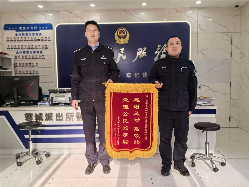 近日,青阳县公安局蓉城派出所收到一份特殊快递——一面从福建寄来的锦旗,上面写着“感谢及时 高效的处理公民的求助”。